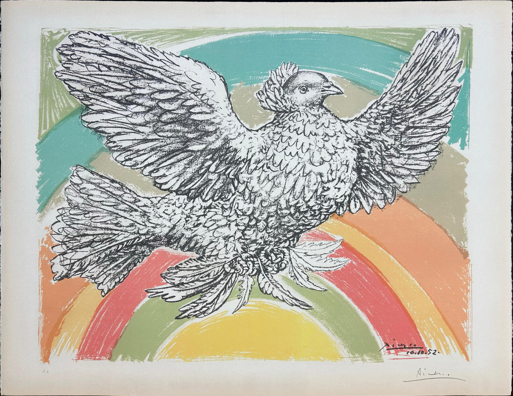 68.5 x 99 cmThis image was donated by Picasso to the Paris Peace Movement in 1950. An avowed leftist, he would regularly donate original works to them in lieu of money and authorize them to make lithographic editions of the images.